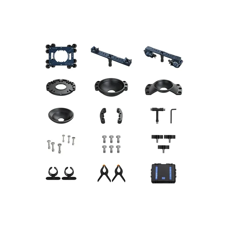 The MOVMAX Grip Dolly Pro Kit is a heavy-duty dolly system with a load capacity of 198 lbs. It includes a flat plate, 75/100/150mm ball adapters, a Mitchell plate adapter, and polymer track wheels for stable movement. The dolly features multiple 1/4-20 and 3/8-16 threads, middle and side supports, and comes with a flight case for easy transport and storage.