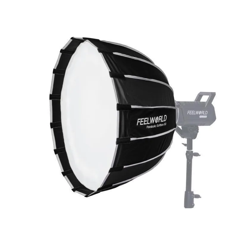 FEELWORLD FSP60 is a deep parabolic softbox with a diameter of 60cm. It adopts film industry-grade soft light material and highly reflective coating. It has a soft light surface in diameter and smooth transition to suppress cross light, ensuring relatively accurate color temperature and satisfying the needs of lighting engineer for soft light effects and light output. Easy to disassemble and store, it is an ideal choice for video production, live streaming, studio recording, portrait photography, product videography, etc.