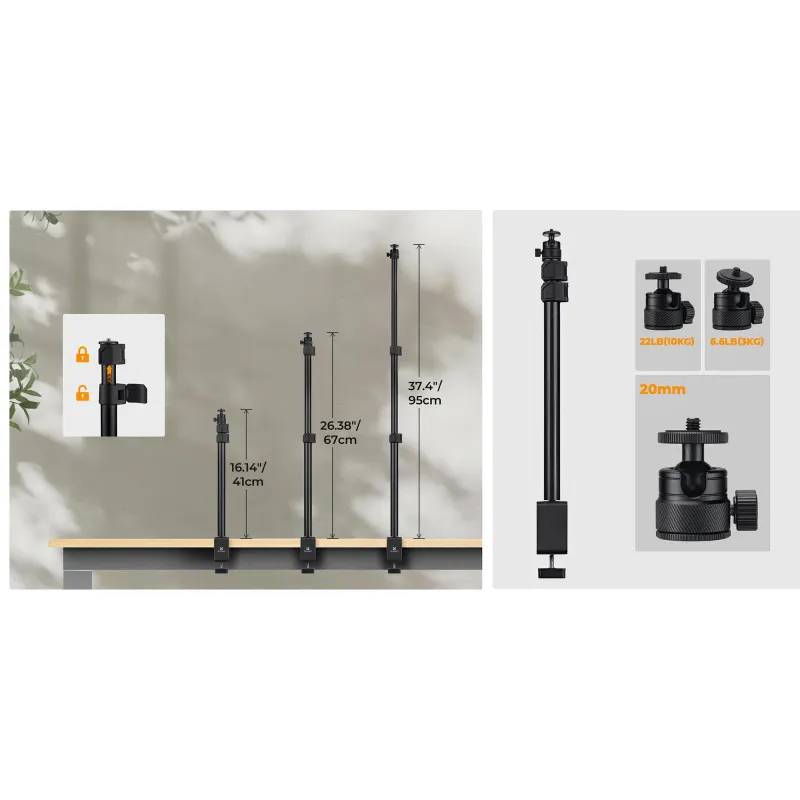 Dėl teleskopinio dizaino, sudaryto iš trijų sekcijų, K&F Concept C-Clamp stalinis laikiklis siūlo sklandų aukščio reguliavimą nuo 37 iki 91 centimetrų. Snap-lock sistema leidžia greitai nustatyti reikiamą lygį ir saugiai užfiksuoti padėtį. Nesvarbu, ar filmuojate akies lygyje, ar reikia virš galvos, šis laikiklis per kelias sekundes prisitaikys prie jūsų poreikių!