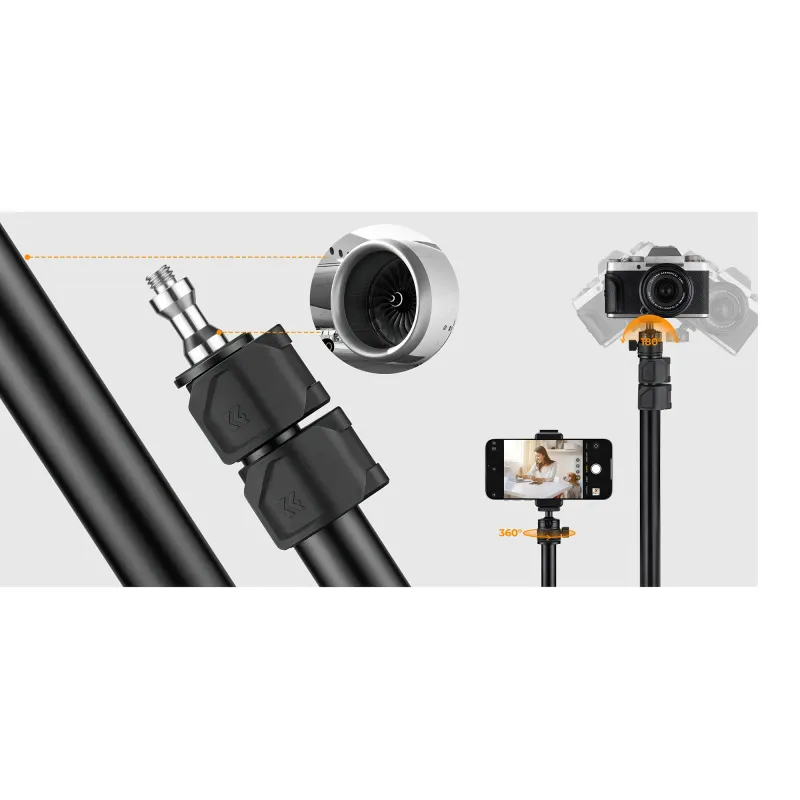 K&F Concept C-Clamp stalinis laikiklis tiekiamas su kamuoliuko galva, kuri siūlo 360 laipsnių sukimosi ir -90 iki +90 nuolydį. Tai leidžia greitai pakeisti kameros orientaciją iš horizontalaus į vertikalų ir tiksliai nustatyti fotografavimo kampą. Galva palaiko standartinį 1/4 sriegį, leidžiantį montuoti kameras, vaizdo kameras, LED šviestuvus, telefono laikiklius ar mikrofonus. Įtrauktas 1/4 iki 3/8 adapteris plečia suderinamumą su didesnėmis žiedinėmis šviesomis ar LED plokštėmis.