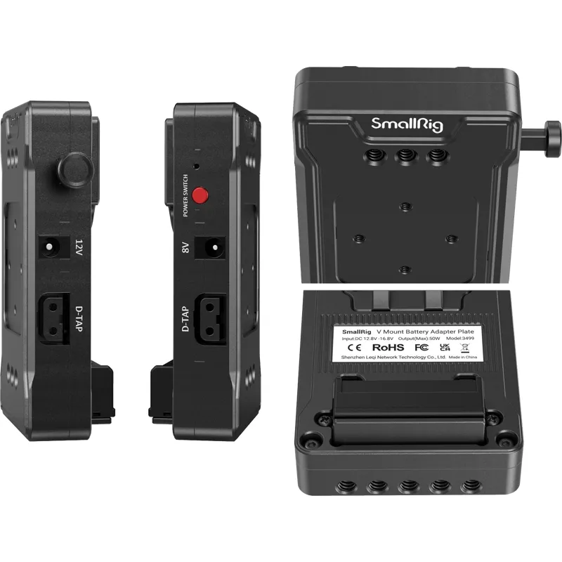 SmallRig V Mount Battery Adapter Plate (Basic Version) with Extension Arm 3499 is designed to provide greater battery life to your camera rig via a V mount battery. Its standard quick-lock V mount supports most V mount batteries. Output ports, including an 8V DC port, a 12V DC port, and two 14.8V D-Tap ports, work with a V mount battery to power your camera and other equipment (e.g. monitor, transmitter, follow focus, mobile phone, etc.). It features a power switch that controls all of the output ports more quickly and conveniently and comes with a 15mm dual rod clamp with an adjustable extension arm that suits a 15mm rail support system and can quickly reposition the battery adapter plate. In addition, multiple 1/4”-20 thread holes allow attaching other accessories such as super clamp mount and magic arm.
