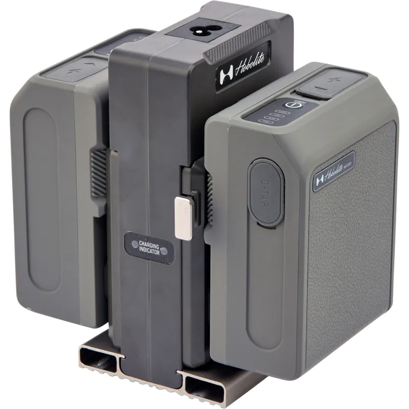 When connected to a wall outlet, the Dual V-Mount Battery Charger from Hobolite provides simultaneous charging for two 95Wh V-mount batteries.