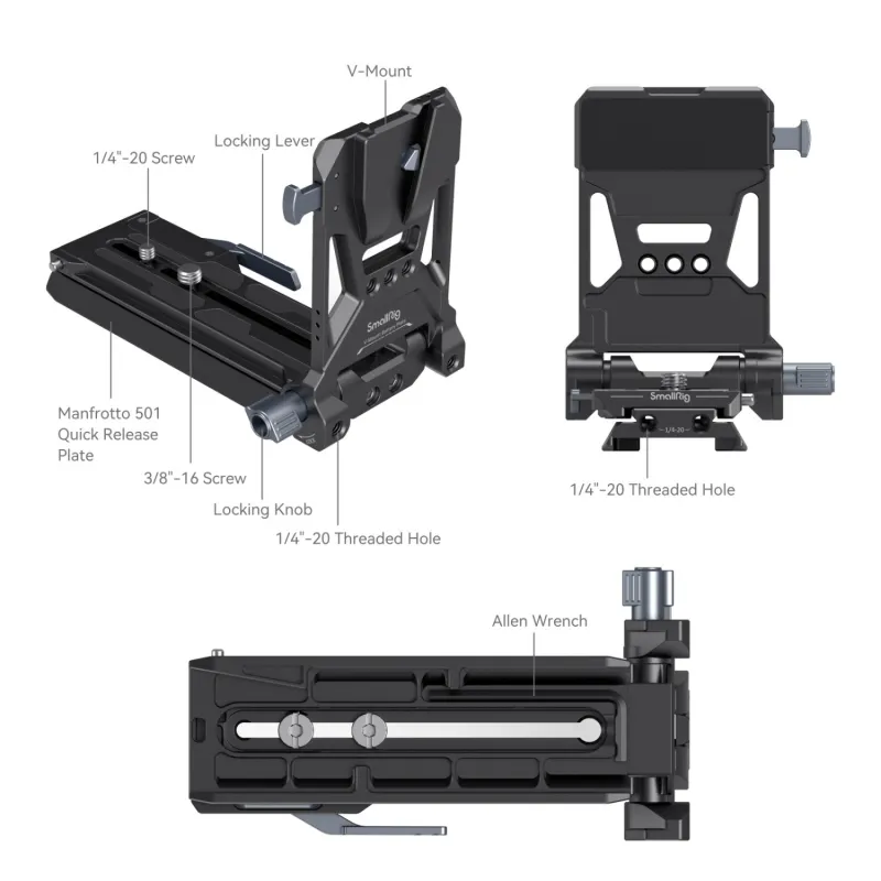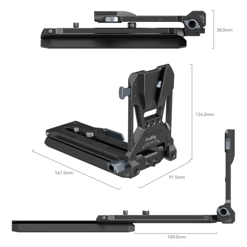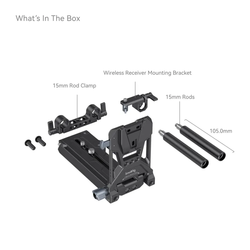 SmallRig V-Mount Battery Mount Plate Kit for Cinema Cameras 4323 is a compact, lightweight, fast, and all-in-one V-Mount battery expansion solution for small cinema cameras. The kit includes a V-Mount battery mount plate kit, a 15mm rod clamp, 15mm rods, and a wireless receiver mounting bracket. The V-Mount battery mount plate kit adopts an integrated design, and is ready to be installed, which allows to quickly mount a V-Mount battery. With a modular design, the V-Mount battery mount plate kit weighs about 300g, and only 230g with the bottom Manfrotto 501 quick-release plate removed, making handheld shooting easier. The baseplate can be stretched by about 100mm / 4.0in to quickly solve the problem of the center of gravity due to heavy lenses.