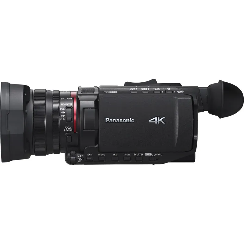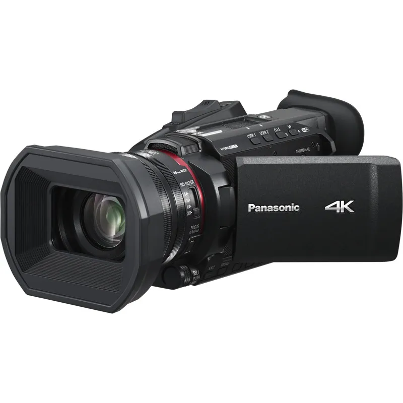 A compact camcorder featuring a 25mm wide-angle lens, 24x optical zoom, and high-precision 4K autofocus, ideal for various video productions.
