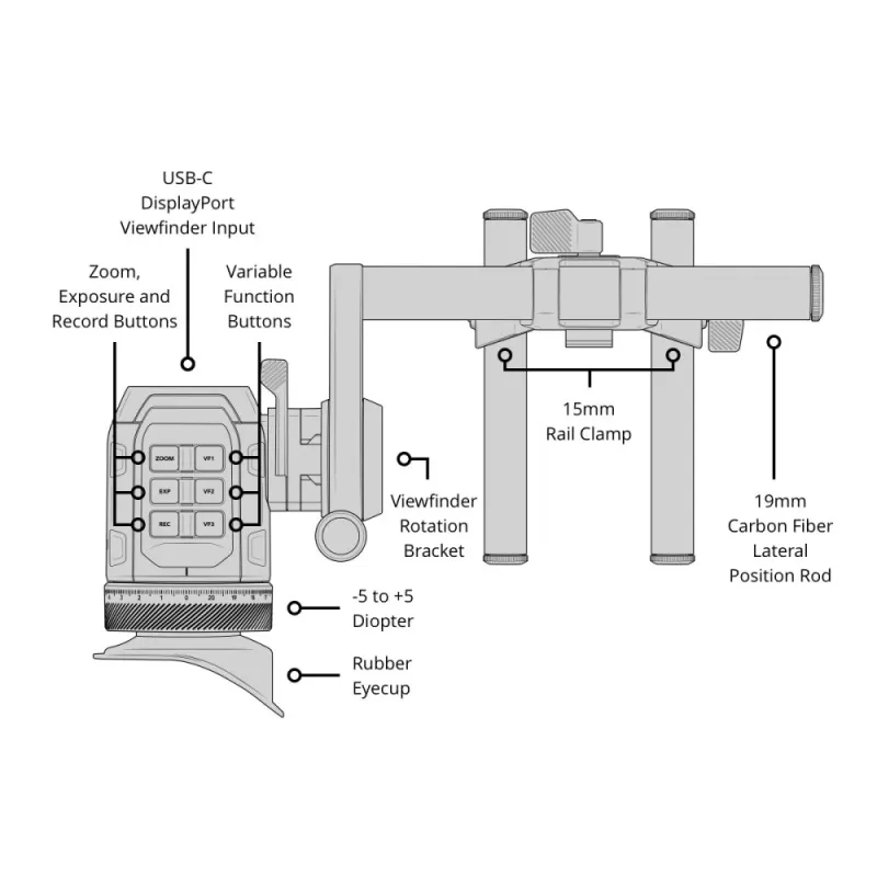 High quality viewfinder with full HD OLED display, precision glass optics, adjustable diopter and function buttons. Quick set up with versatile mounting and single USB-C cable for power and video.