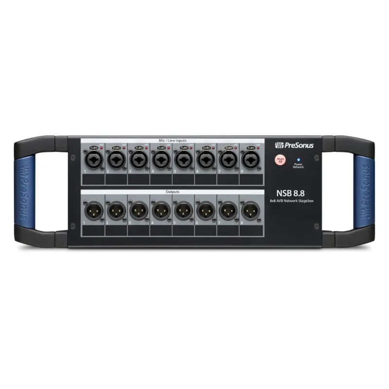 Designed to work seamlessly with PreSonus StudioLive Series III mixers, the PreSonus NSB 8.8 stage box offers 8 locking combo mic/line inputs with remote-controlled XMAX preamps that include gain compensation for shared input scenarios, as well as 16 direct inputs via AVB. All inputs can be controlled from a StudioLive Series III console and from free PreSonus UC Surface software.