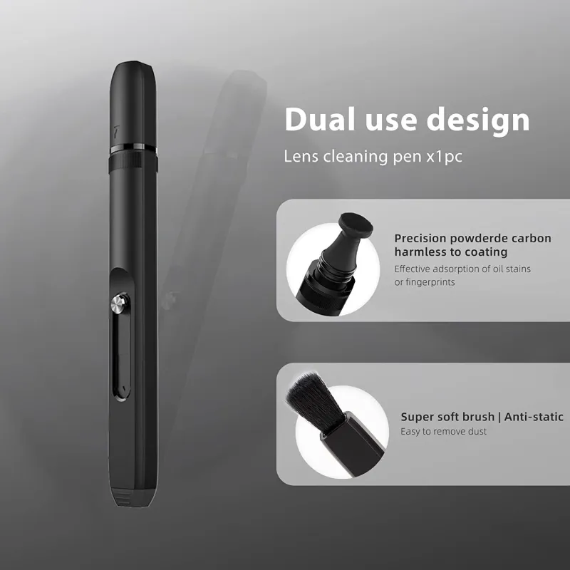 2in1 cleaning brush and pen Perfect for cleaning optical surfaces Brush for sweeping larger dust particles Pen for cleaning even the smallest smudges Compact mini-size design