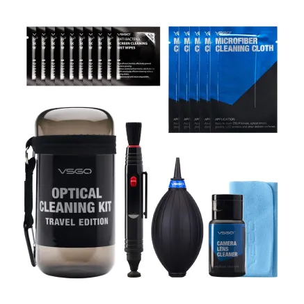 Handy cleaning kit for lenses Air pump & dust brush Microfiber cloth & moist wipes 30 ml cleaning solution Belt bag for storing everything