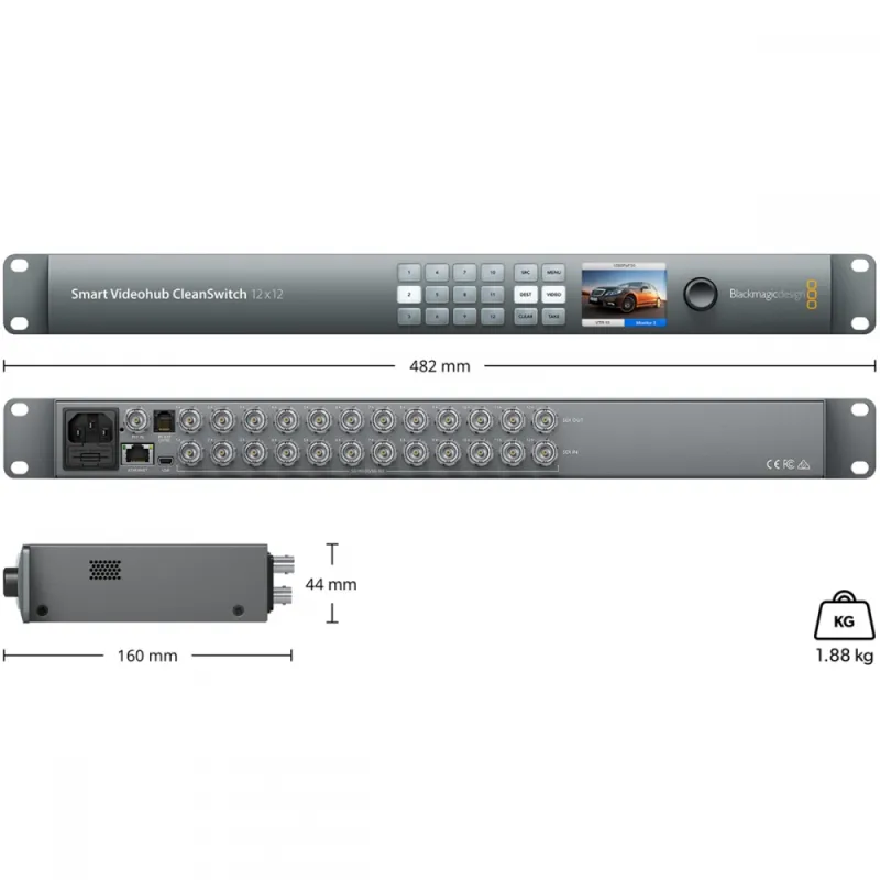 Blackmagic Smart Videohub CleanSwitch 12x12 includes an elegantly designed machined metal front panel, built in power supply, external ethernet control, RS422, and support for tri-sync and black burst reference. The router can also be controlled remotely via Ethernet using Blackmagic Design router control software for Mac OS X and Windows, or with the Blackmagic Smart Control and Master Control hardware router control panels.