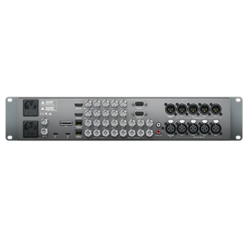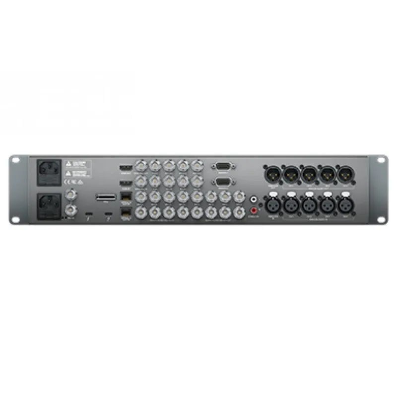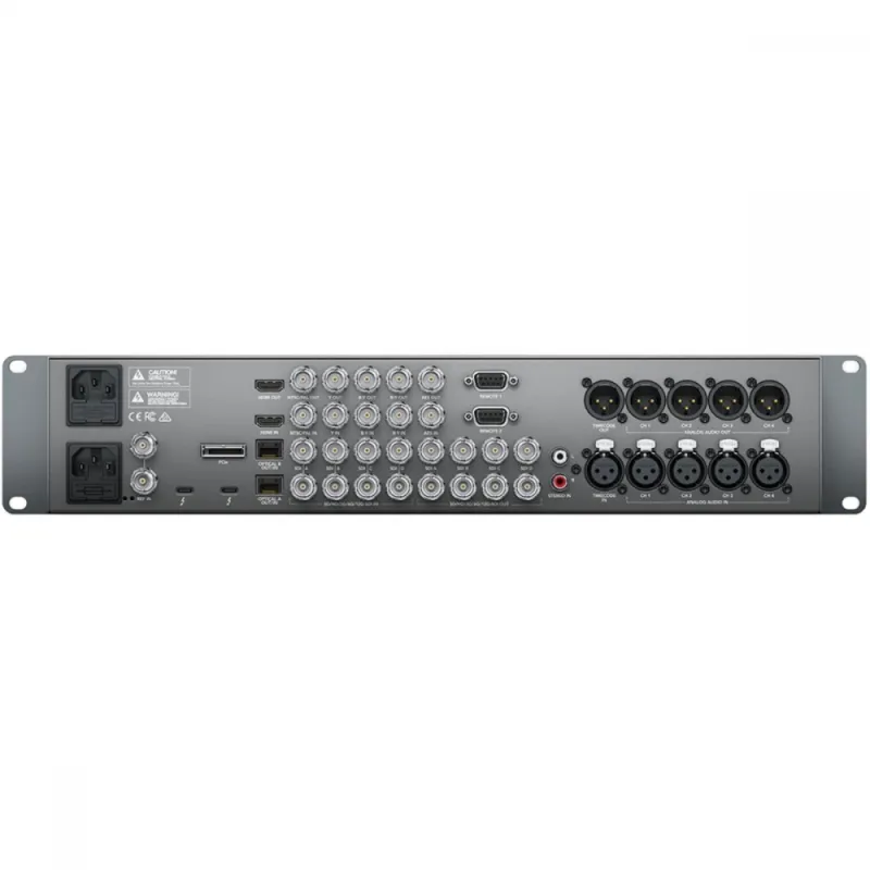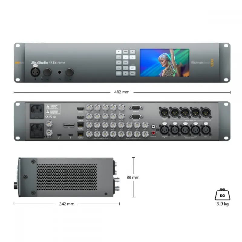 Designed to be used on a desktop, or installed into equipment racks, UltraStudio 4K Extreme 3 features an attractive, machined aluminum front panel with an integrated color display and buttons for quickly selecting input sources for video, audio, timecode and deck control. The rear panel includes virtually every type of video and audio connection that exists, including 12G-SDI, HDMI 2.0, analog component and composite video, balanced XLR and AES/EBU digital audio, as well as expansion cages for optical fiber SDI connections, RS-422 deck control inputs, dual power supplies and more.
