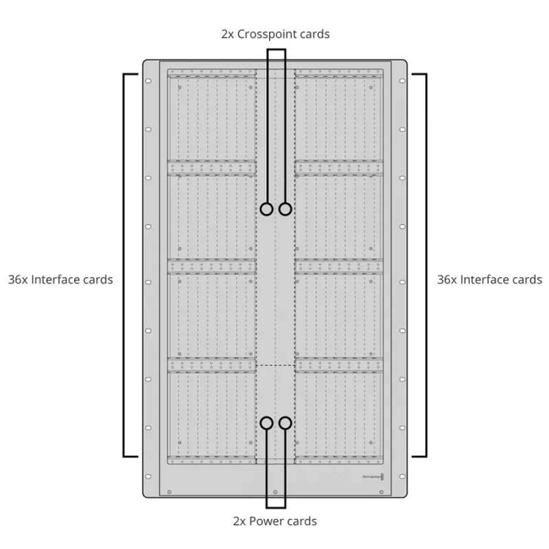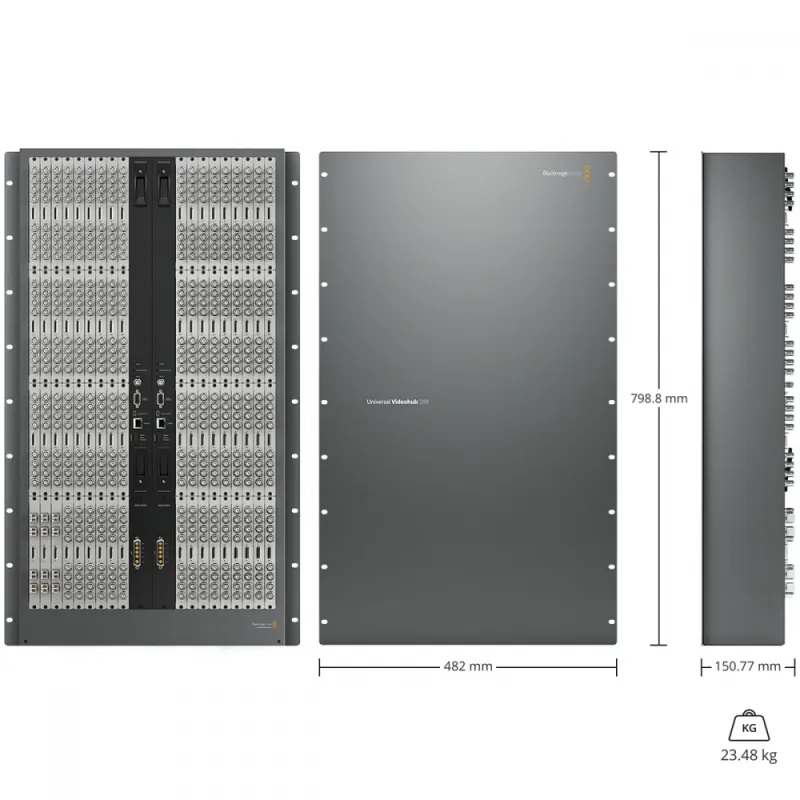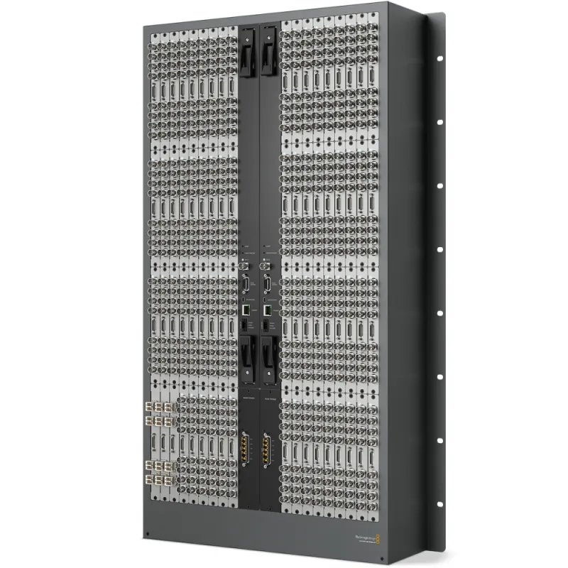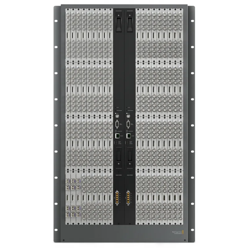 Supports up to 288 x 288 SDI and 288 x 288 deck control, ethernet/serial router crosspoint control, genlock, alarm GPI and alarm indictors. Compatible with Universal Videohub 288 frame.