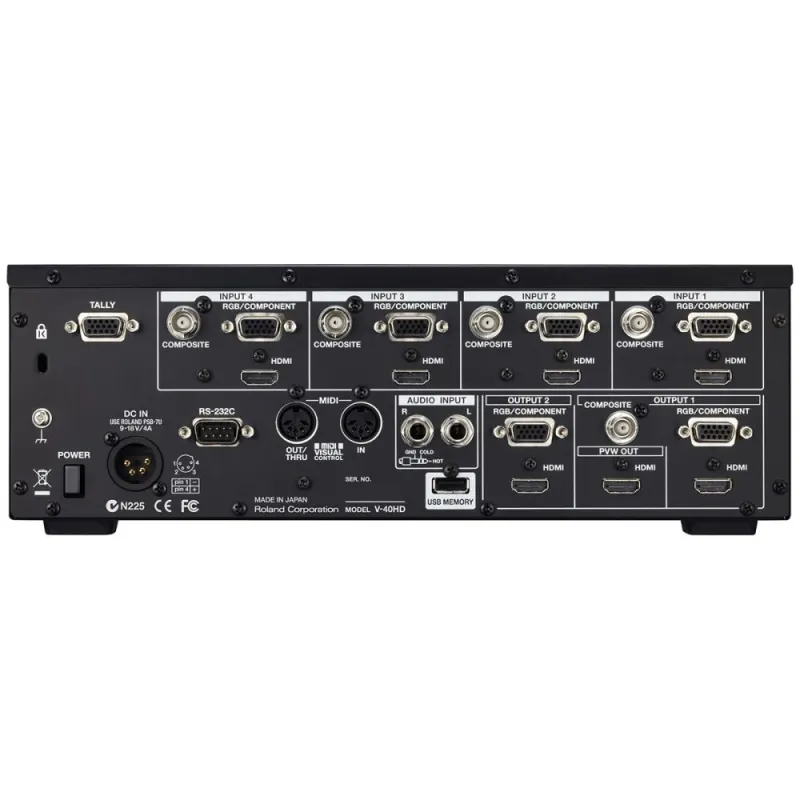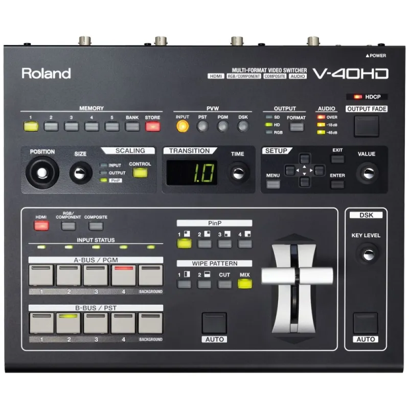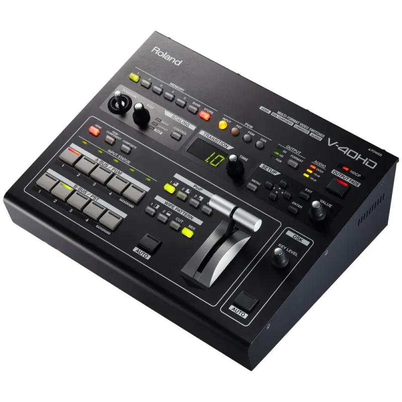 The Roland V-40HD Multi-Format Live Video Switcher is a welcomed addition to the powerful V-1600HD and V-800HD model lineup. The V-40HD Live Video Switcher is ideal for any live event or installation that requires the freedom to connect a variety of sources whether they be digital or analog, computer or video format. It is particularly positioned to support configurations using popular HDMI cameras as well as computers.