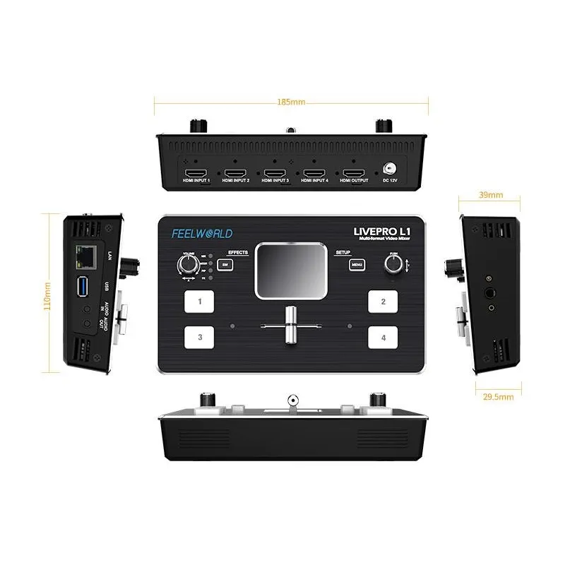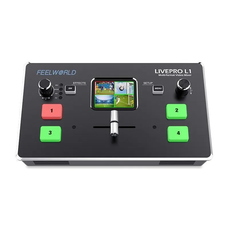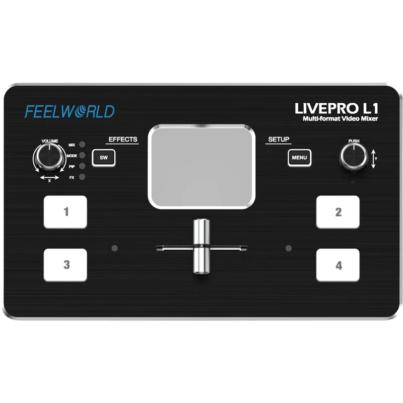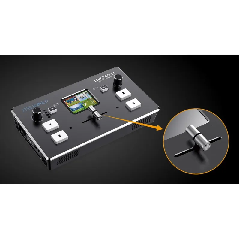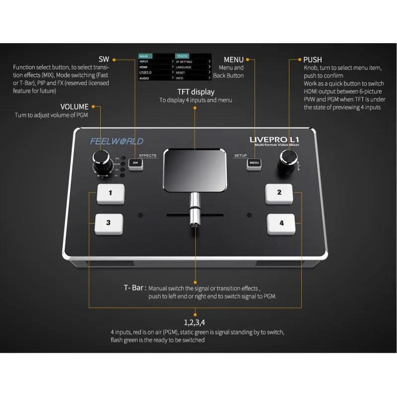 LIVEPRO L1 ir izsmalcināts un kompakts vadības panelis. Četras pogas ir paredzētas ievades signālu atlasei. Zaļa mirgojoša gaisma nozīmē, ka signāls ir izvēlēts, pēc tam pārslēdziet ar T veida stieņa slēdzi. Izvēlētais signāls, kas tiks parādīts ekrānā, ir nevainojams. Pēc pārslēgšanas zaļā pogas gaisma mainīsies uz sarkanu. Poga Menu (Izvēlne) ir paredzēta, lai iestatītu izvēlni. Poga SW ir dažādu funkciju izvēlei, piemēram, sajaukšanai, mērogošanai, pārejas laika iestatīšanai un citām funkcijām. Kreisā grozāmpoga ir paredzēta balss skaļuma kontrolei, savukārt labā grozāmpoga ir paredzēta arī izvēlnes iestatīšanai. Ierīcei ir divu pogu kombinācija ar leņķa regulēšanu PTZ kamerai. No TFT ekrāna var priekšskatīt četrus HDMI signālus un ērti iestatīt izvēlnes iestatījumus.