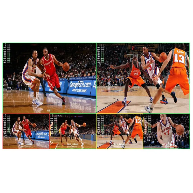 Kad pārslēdzējs ir savienots ar ārēju paplašināšanas ekrānu, tas var priekšskatīt reāllaika novērošanu ar sešiem attēliem, ieskaitot PGM, PST un četru kanālu HDMI ieejas signālus, un tiek parādīta audio kolonna. Turklāt PIP (attēls attēlā) režīmam varat iestatīt deviņus izkārtojumus. Tas ir ļoti noderīgi liela mēroga stendu lauka producēšanai.
