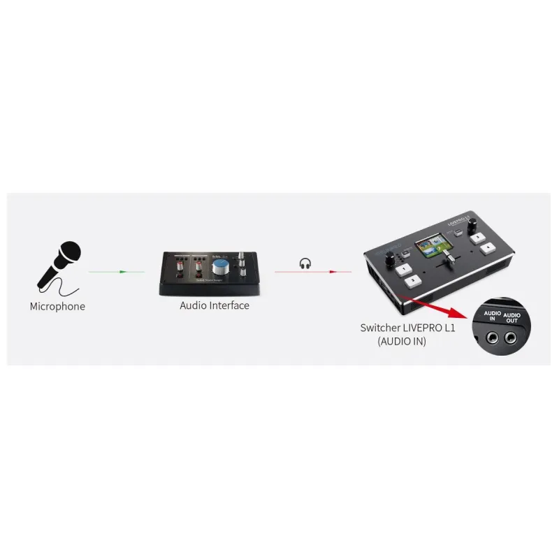 • If there is microphone and audio interface, please connect microphone to the audio interface and connect the output interface of the audio interface to the AUDIO IN interface of LIVEPRO L1.