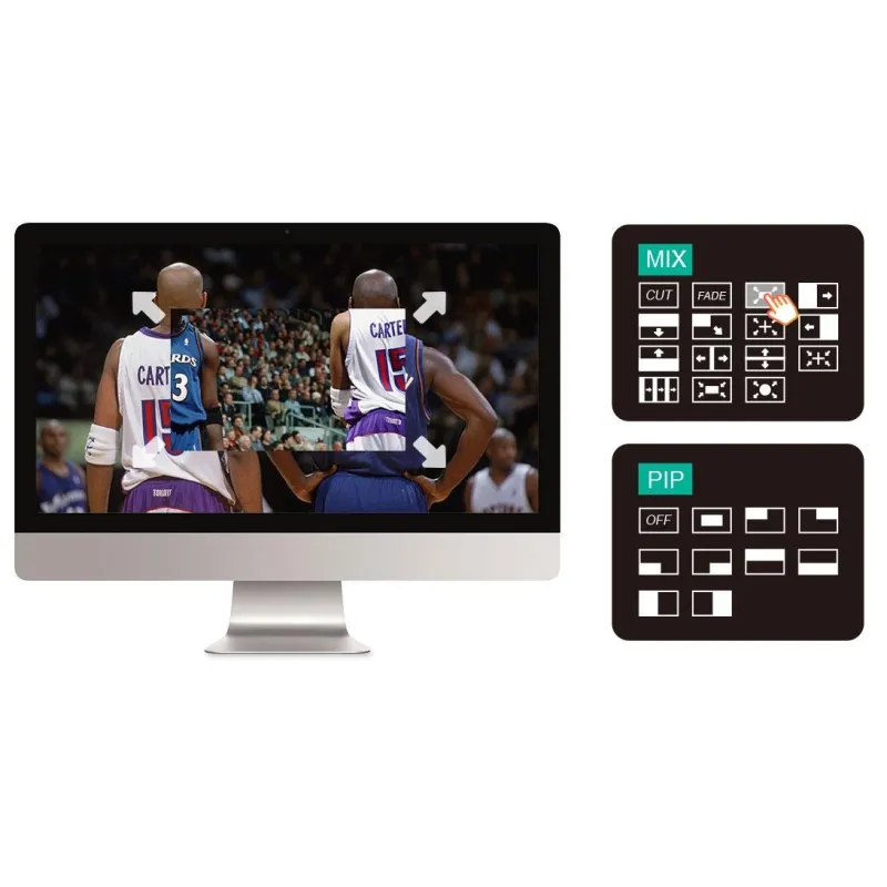 When the switcher is connected with an external expansion screen, it can preview real-time monitoring on 6 pictures, including PGM, PST and 4-channel HDMI input signals, and the audio column is displayed. Plus, you can set 9 layouts for PIP (Picture in Picture) mode. This is very useful for large-scale multi stand field production.
