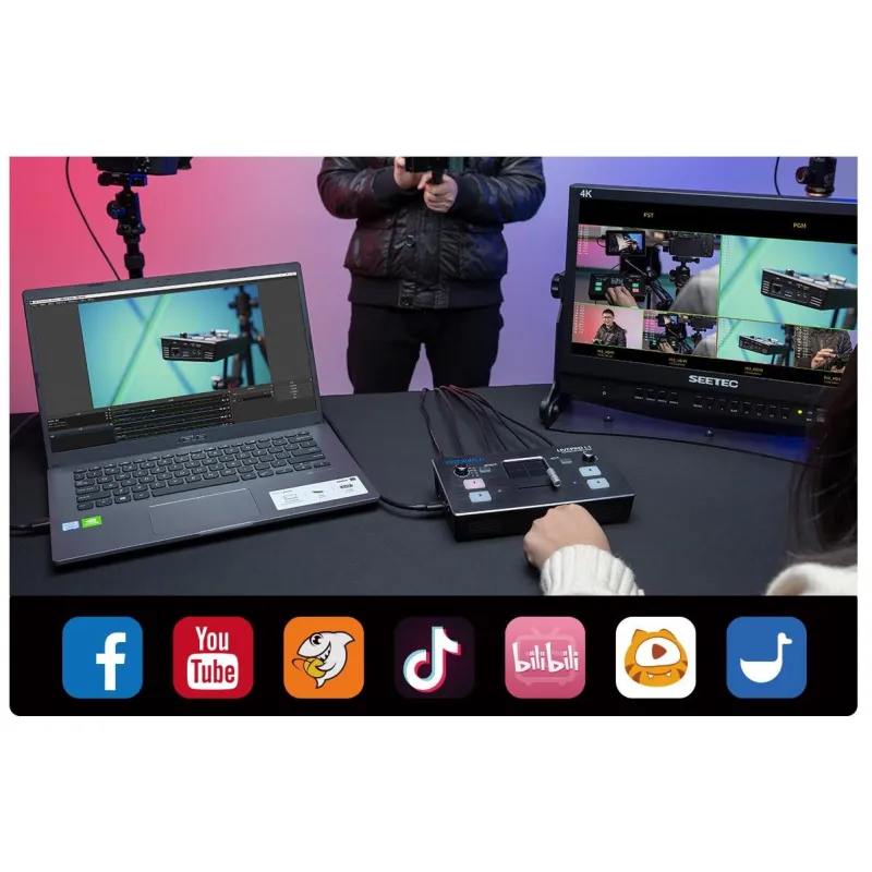 Tiešraides producēšana ir ātrākais veids, kā pabeigt gatavu programmu, kā arī jūs varat to straumēt vienlaikus tiešraidē visā pasaulē, izmantojot Youtube. LIVEPRO L1 USB 3.0 izeja ļauj ierīci savienot ar jebkuru datoru un izskatās kā iebūvēta tīmekļa kamera, tāpēc ir iespējams izmantot visu veidu straumēšanas programmatūra sociālo plašsaziņas līdzekļu platformām. Izmantojot līdz pat četrām HDMI ieejām, varat iestatīt vairākus kameras leņķus, piemēram, platleņķa kadrus, kā arī atsevišķus tuvplānus ar katru priekšnesuma personu. Vai arī varat izveidot savienojumu ar datoru, izmantojot PowerPoint slaidrādi, videoklipu atskaņošanu, tīmekļa vietnes vai spēļu konsoles. Visa pārslēgšanās notiek reāllaikā, lai jūs varētu tiešraidē straumēt uz jebkuru sociālo plašsaziņas līdzekļu platformu, piemēram, Youtube, Facebook, Tik Tok, Douyu TV un daudzām citām!