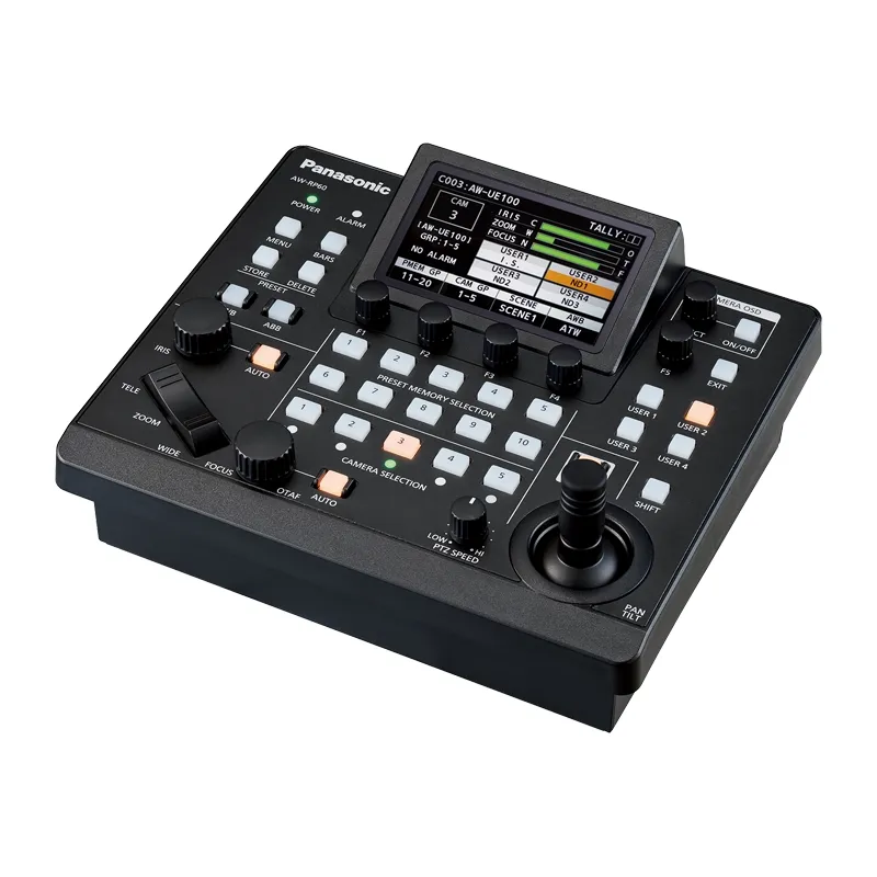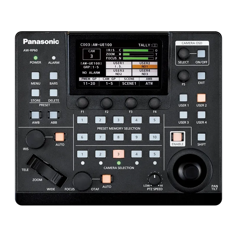 The AW-RP60 Remote Camera Controller is equipped with a large LCD to display a GUI menu screen with clear visibility and an improved joystick for smoother control, this controller is compatible with all current Panasonic PTZ models. Thanks to the improved GUI, now all important information about the cameras, such as iris, zoom and focus can be seen at all times directly on the screen.