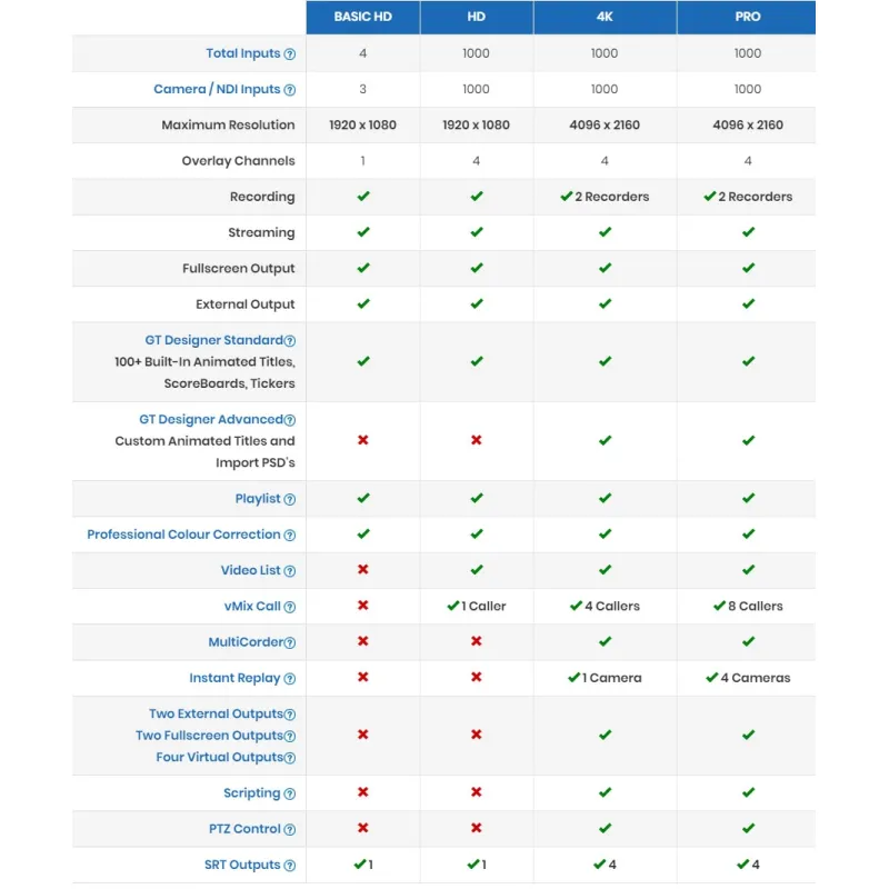 The vMixPRO version has all the parameters of the vMix4K software, but also includes