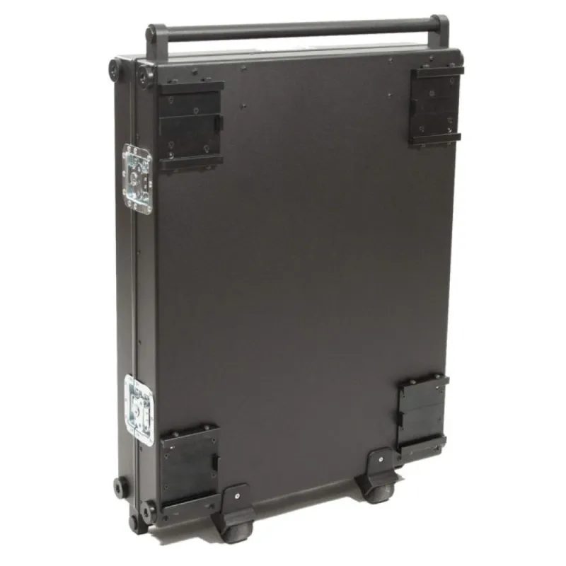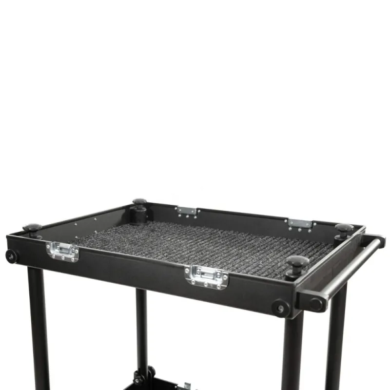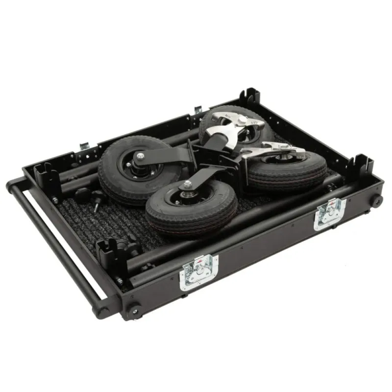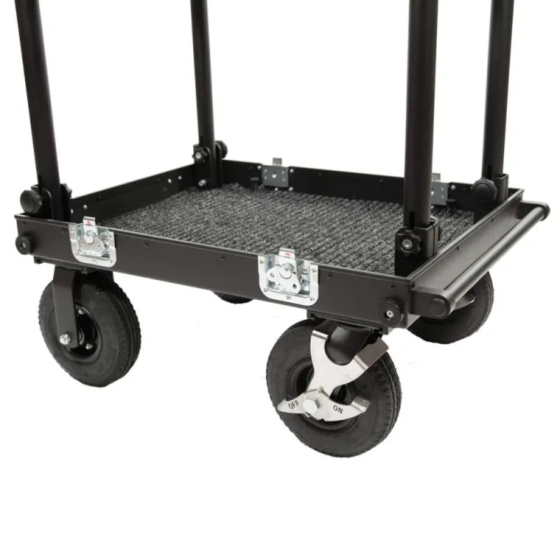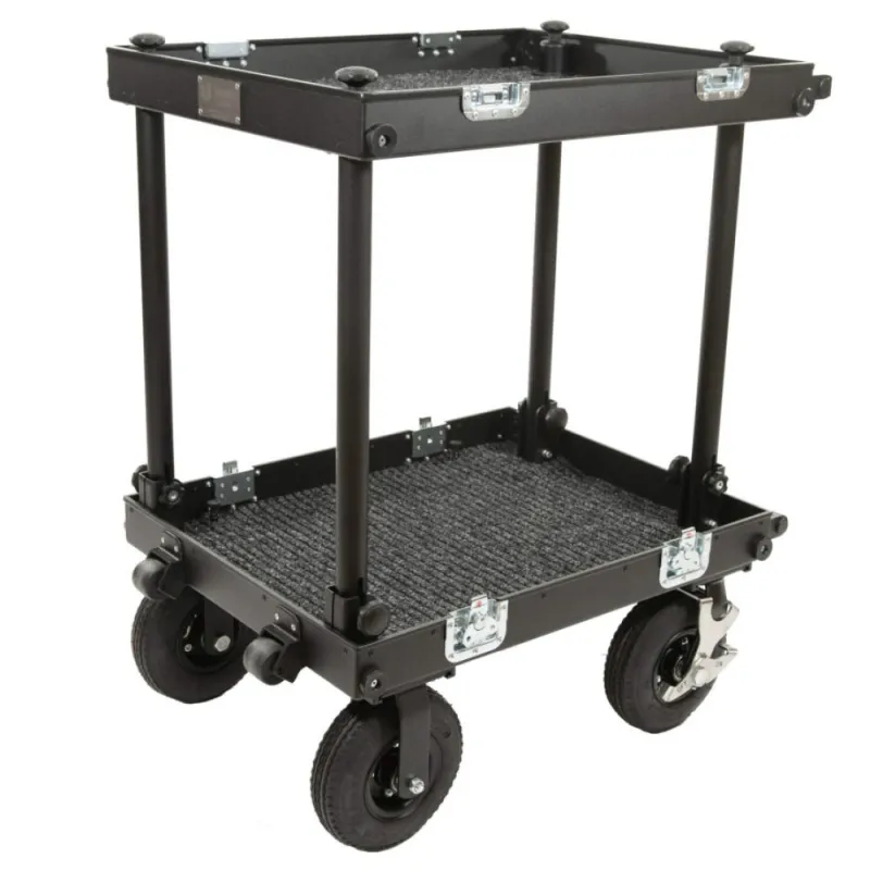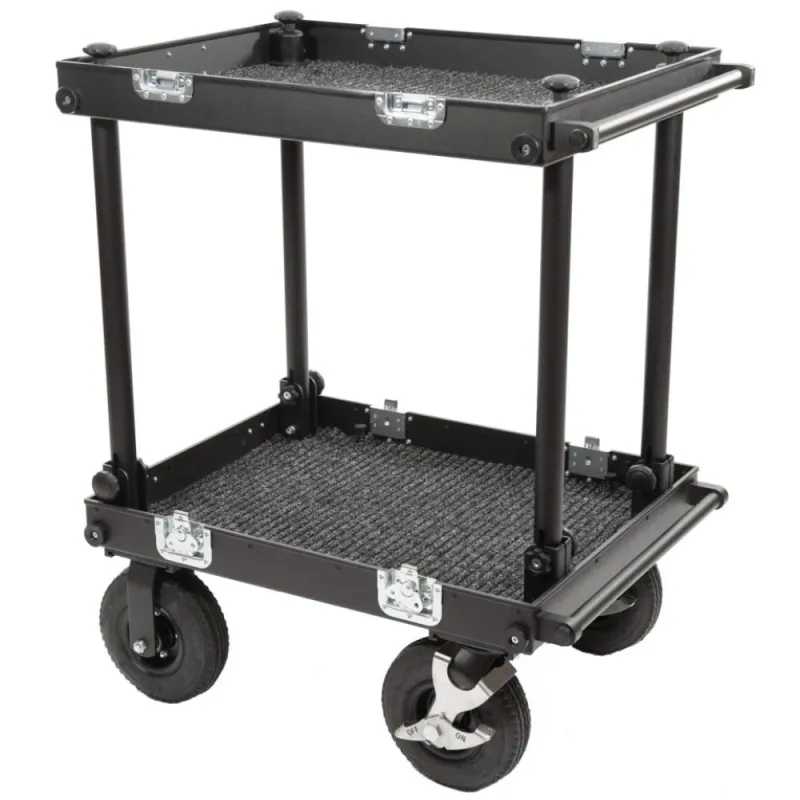 The Smartone Mini double deck cart is designed for transporting equipment or as a sound department cart. It is made of durable materials to withstand harsh on-set conditions. The cart features 4-layer gum tires on strong steel rims with 2 manual foot brakes for secure routing on various surfaces. The aluminum structure is lightweight yet can hold up to 200 kilograms. No tools are needed to attach or remove wheels or parts, saving time. The cart is easy to collapse and set up in under 2 minutes. It includes small transport wheels, props, and deflects for improved usability. Its compact size allows for easy transportation in one case.