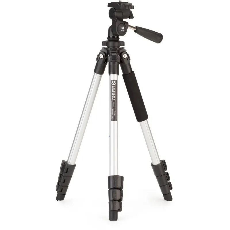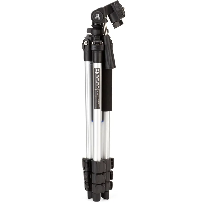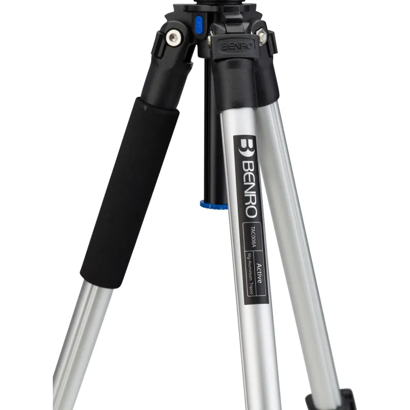 The TAC008AP0 Active Aluminum Tripod with P0 3-Way Pan/Tilt Head from Benro can support up to 8.8 lb and weighs 2.1 lb. It extends to 55.9", folds to 19.7", and has a minimum height of 13.4". Flip locks keep the 4-section legs at your desired height, and rubber feet prevent the tripod from slipping on smooth surfaces.