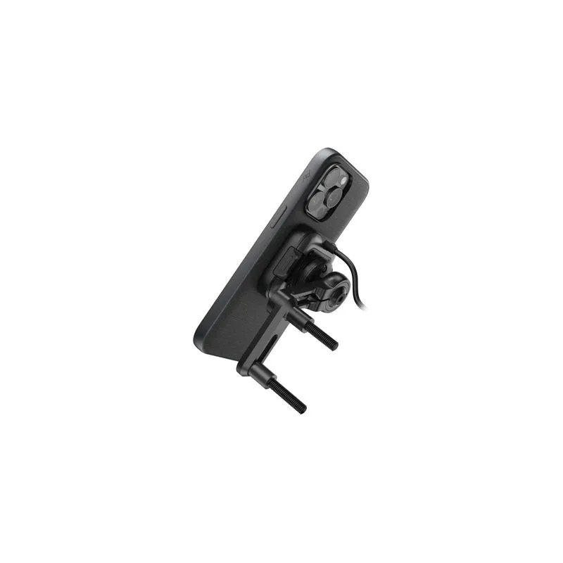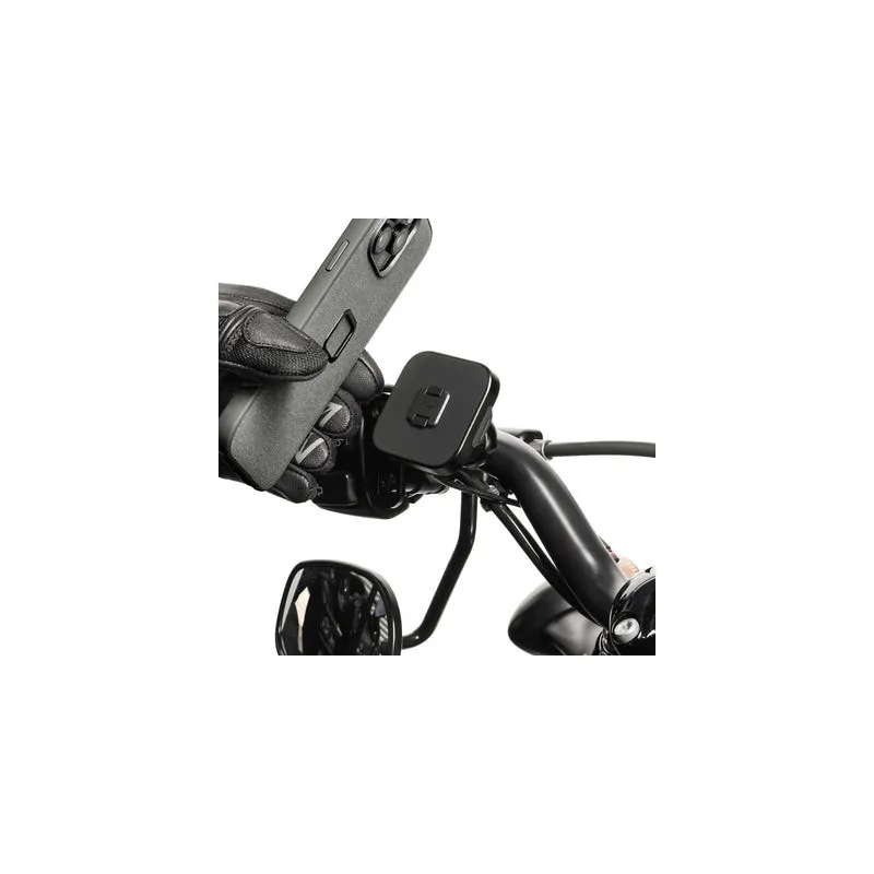 A low-profile phone mount that reduces handlebar clutter, the Motorcycle Brake/Clutch Mount attaches to the bolt threads in your brake or clutch perch and keeps your phone rigidly secure, instantly accessible, perfectly viewable, and fully charged with industry-leading Qi2 wireless charging (optional). Securely installs into the bolt threads of most brake and clutch perches, and is ideal for bikes with already-crowded handlebars, or V-twin cruisers with handlebar diameters over 1.25.