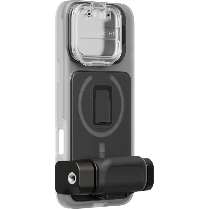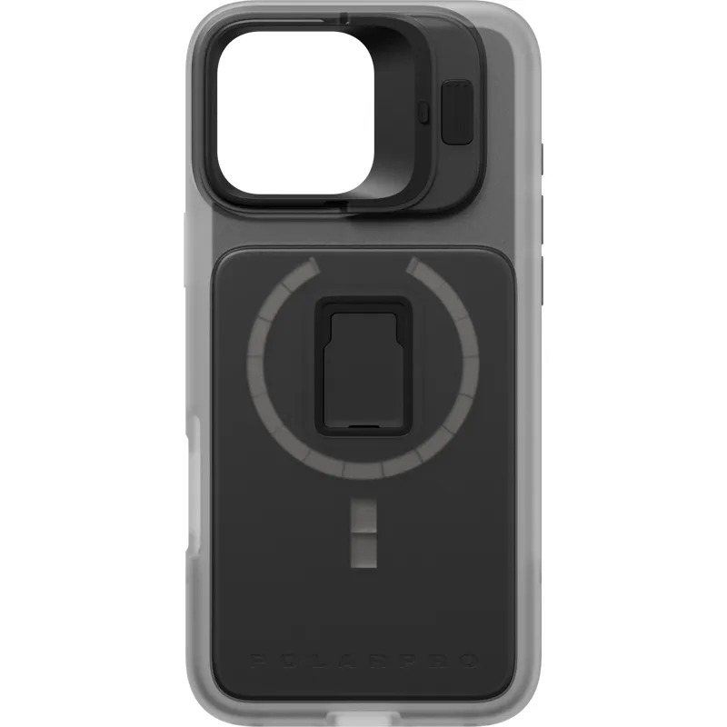 It includes an aluminum cold shoe mount on the back for a stable attachment point for your iPhone 16. The new Flip-Down lens protector allows for quick shots without removing the lens. Additionally, the MagSafe array has been made twice as thick and durable for a secure connection with vehicle mounts.