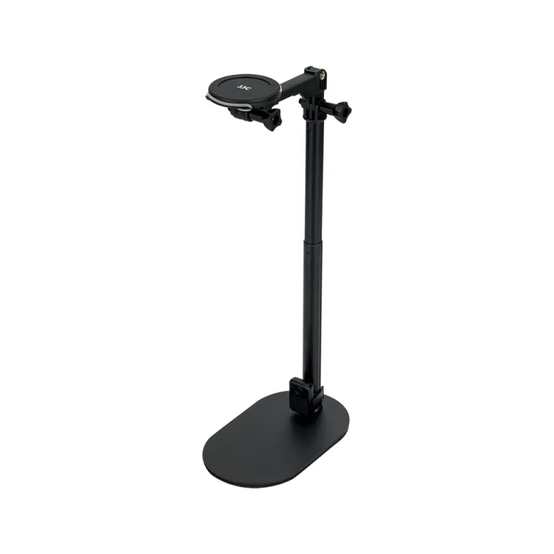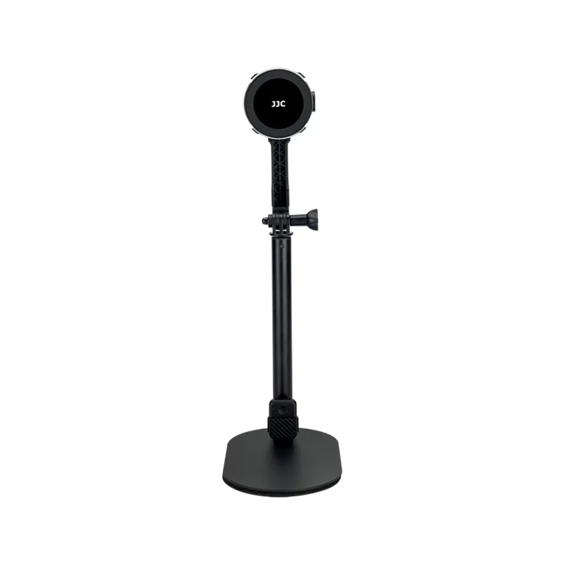 JJC MSS 1 Magnetic Desktop Stand with Wireless Remote Control is specially designed to mount a cell phone or compact camera for Vlog recording, live streaming and mobile filmmaking. It has a magnetic phone mount suitable for a MagSafe enabled cell phone, such as the iPhone 12/13/14 series or the latest models (without a phone case), and a cell phone with a MagSafe phone case (both official and third party), a non MagSafe phone (iPhone 11 and earlier models, other Android phones or with a non MagSafe case) by using the trackless 3M adhesive metal ring included with the product. The product has a 1/4 20 threaded base and supports attaching a compact camera via its 1/4 20 mounting thread.