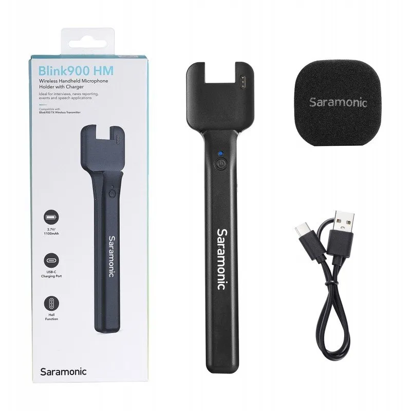Saramonic Blink900 HM Handheld Mount for Transmitters The Saramonic Blink900 HM Handheld Mount for Transmitters is a revolutionary device that will easily transform the Blink900 TX microport into a reporter microphone. The clip-on mount allows you to connect accessories in a second. The ergonomically designed handle will be great for interviews, live coverage, events and conferences. The built-in rechargeable battery will allow you to charge the Blink900 TX transmitter twice. Main product features An innovative mount that allows you to convert the Blink900 TX transmitter into a handheld microphone Ideal for interviews, presentations, live reports, speeches, podcasts and many other applications Lightweight and ergonomic design Built-in Li-ion rechargeable battery (1100 mAh) to extend the working time with the transmitter the use of gold contacts ensures efficient charging of the transmitter included foam wind shield and USB-C charging cable Convert the transmitter into a traditional microphone The Saramonic Blink900 HM Handheld Transmitter Mount is a great way to expand the functionality of your Blink900 wireless audio transmission system. A street probe, a wedding toast, a podcast recorded in the field, a live report, a stage performance - in any of these situations you can turn a small microphone into a reporters microphone. Ideal connection The Saramonic Blink900 HM mount is designed to allow you to quickly and easily pair devices within the Blink900 system, without removing the transmitter from the mount. Simply place the microport on top of the accessory and lock its position with the clip. The perfect fit will ensure that the device stays in place while making recordings. Additional power source The Saramonic Blink900 HM handheld is equipped with an 1100 mAh rechargeable battery. It will effectively extend the operating time of the Blink900 TX transmitter. A fully charged holder will allow you to replenish the microports energy twice. Thanks to the use of gold contacts on the holder, you are assured that the charging process of the microport will run without any interference. Wind shield included Included with the Saramonic Blink900 HM mount you will find a foam wind shield that will give the connected devices a professional look. When you put it on the Blink900 TX microport, it will be difficult to distinguish this set from a real microphone. The shield will reduce unwanted wind noise and other interference that could affect the quality of your recordings. Specification model: Saramonic Blink900 HM power supply: built-in Li-ion battery (1100 mAh) handle charging time: 2 h charging time of Blink900 TX transmitter: 2 charges charging port: USB-C dimensions: 195.5 x 43.5 x 22 mm weight: 66 g Kit contents Saramonic Blink900 HM handheld mount for transmitters foam wind shield USB-A / USB-C cable