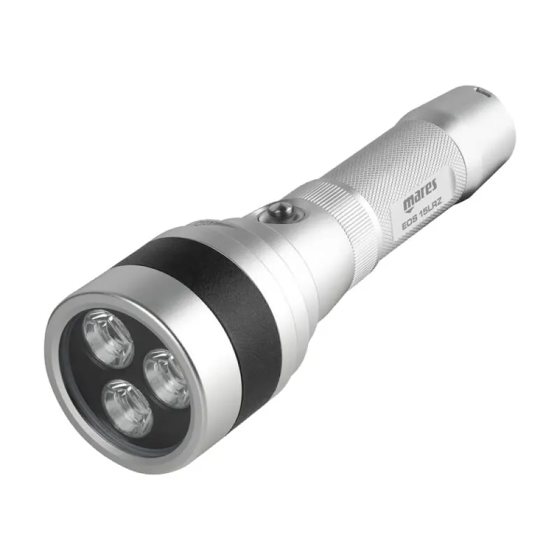 The Mares EOS 15LRZ is a rechargeable underwater torch made of anodised aluminium, delivering 1580 lumens with a runtime of 125 minutes. It features three CREE XP-G2 LEDs for powerful illumination.