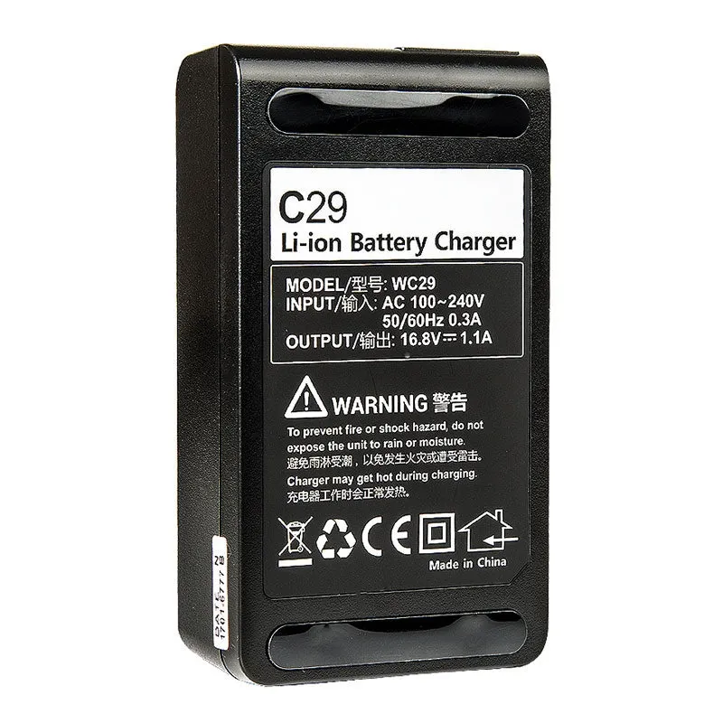 With this Godox C29 Charger you can quickly recharge the Godox WB29 battery for the Godox Witstro AD200 portable flash. This battery charger has LEDs on the top with which you can read the charging status of the battery. The charger comes with an EU power cord.