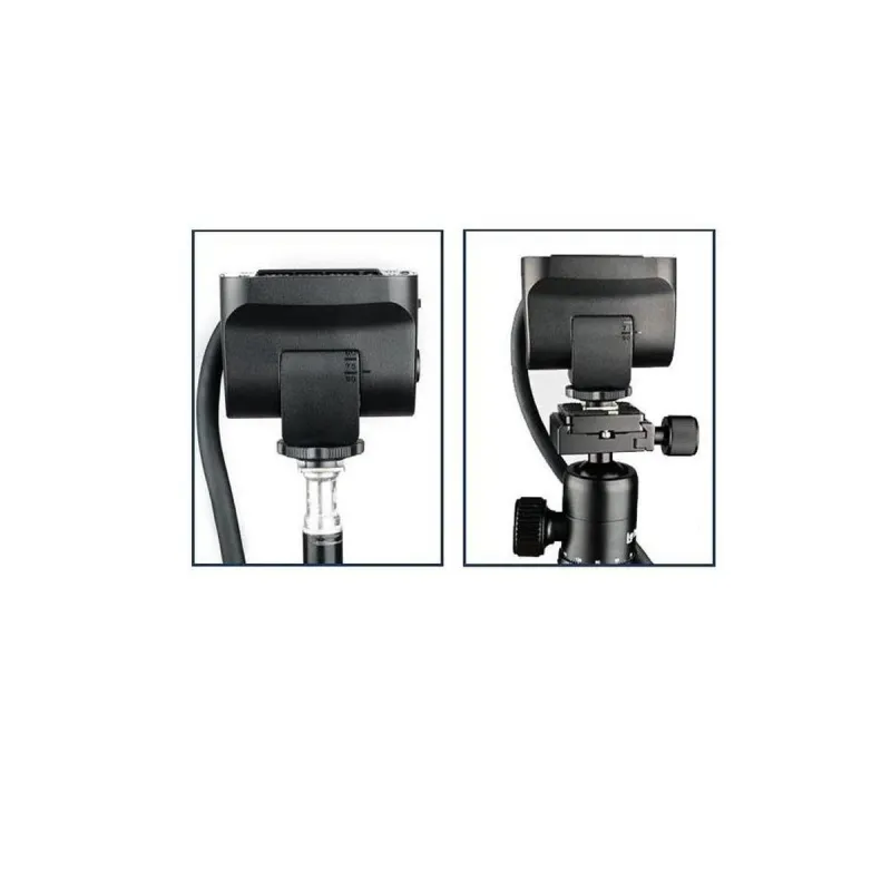 Press the side locking button to tilt the head 90 degrees up. At the bottom you place a foot to attach it to a hot shoe. Using the 1/4 "thread in the center of the base, you can place the exchangeable flash head on a stand or tripod.