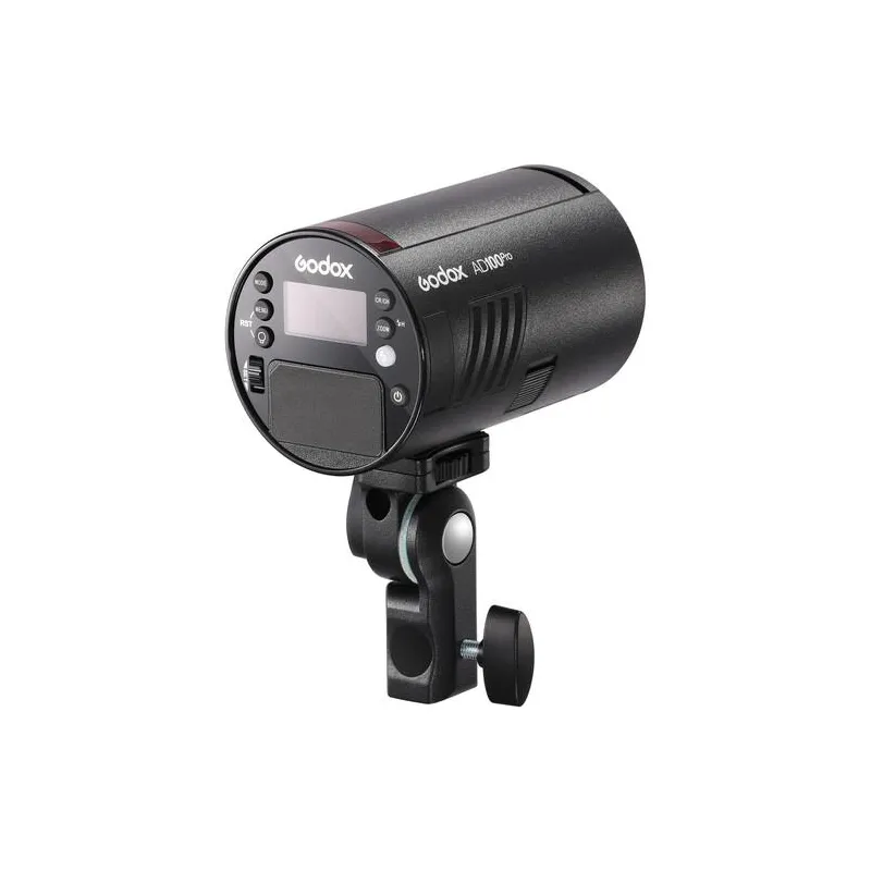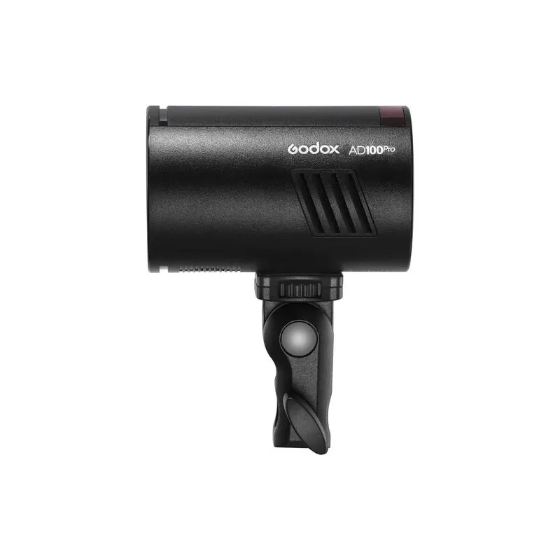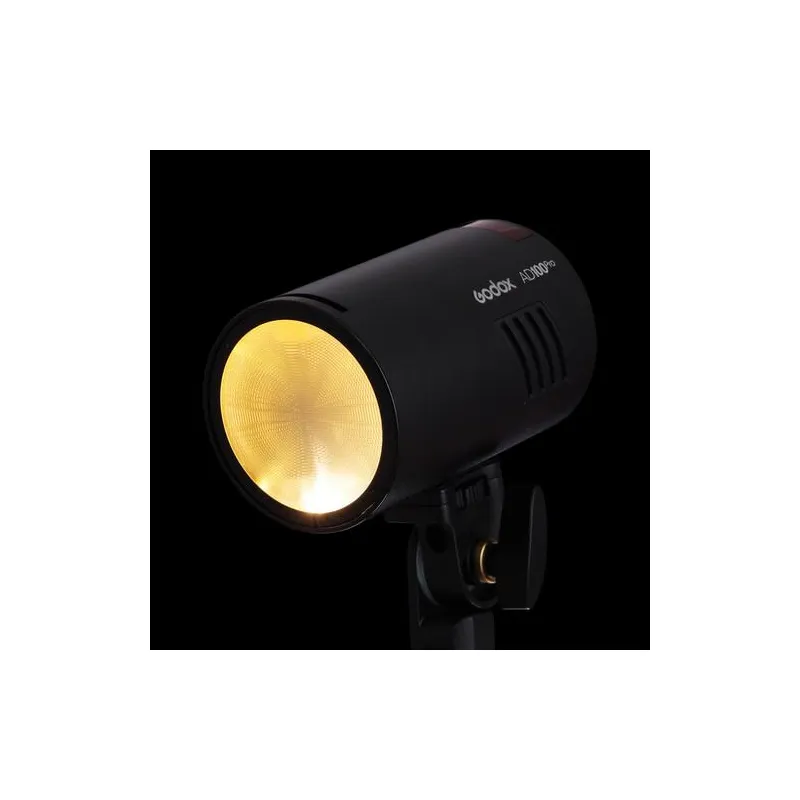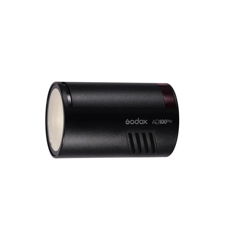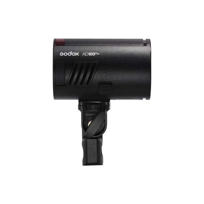 The AD100pro has impressive core features such as 100Ws of power adjustable in nine steps from 1/256 to 1/1, recycling times from 0.01 to 1.5 seconds, and short flash durations. The AD100pro has manual, auto, and stroboscopic capability. Manual mode outputs the user's choice of power, modeling light, and first or second curtain sync. Multi mode controls the stroboscopic rate up to 90 times (90 Hz). Optional wireless transmitters with 32-channel and four groups system control flash mode, first and second curtain sync, High-Speed Sync up to 1/8000 second, power level, and modeling lamp at distances up to 328'. Firmware updates are obtainable on the Godox website.