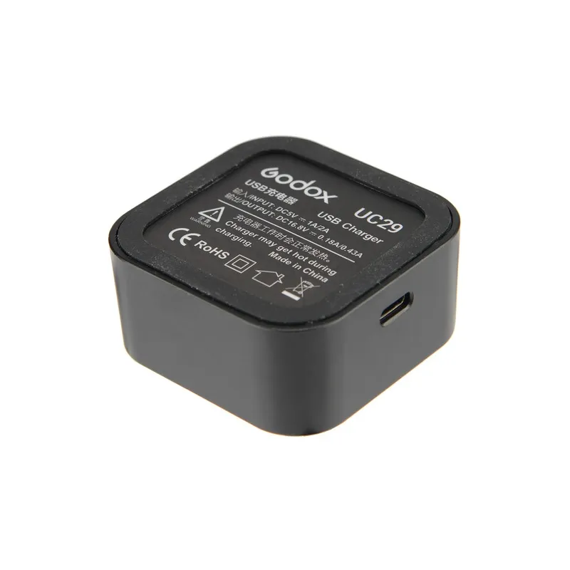 The UC29 USB Charger for AD200 from Godox supplies power to the WB29 battery. The battery provides up to 500 full power flashes.